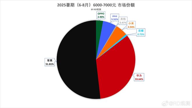 大家注意看上图,这是行业人士“RD观测”提供的暑期6000-7000元市场排名。数据显示在这个售价区间苹果是断崖式领先的,市场占比高达51.8%,换言之其它所有品牌加在一起都不是它的对手,因为苹果的份额已经超过一半了。华为排名第二位,市场占比为33.64%;vivo排名第三位,市场占比为5.51%,谁能想到在这个售价区间vivo会排名第三位,虽然份额少了点,但也值得庆祝一下。小米排名第四位,市场占比为4.94%;OPPO排名第五位,市场占比为2.90%,荣耀排名第六位,市场占比为0.73%。
