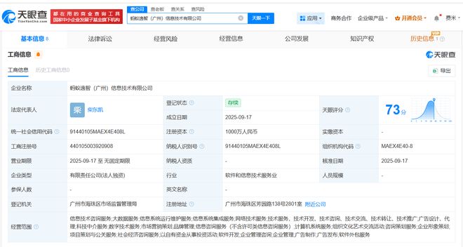 天眼查App显示,近日,蚂蚁逸智(广州)信息技术有限公司成立,法定代表人为柴东凯,注册资本1000万人民币,经营范围包括信息技术咨询服务、大数据服务、信息系统运行维护服务等。股权全景穿透图显示,该公司由蚂蚁集团旗下广州灵知智慧科技有限公司全资持股。