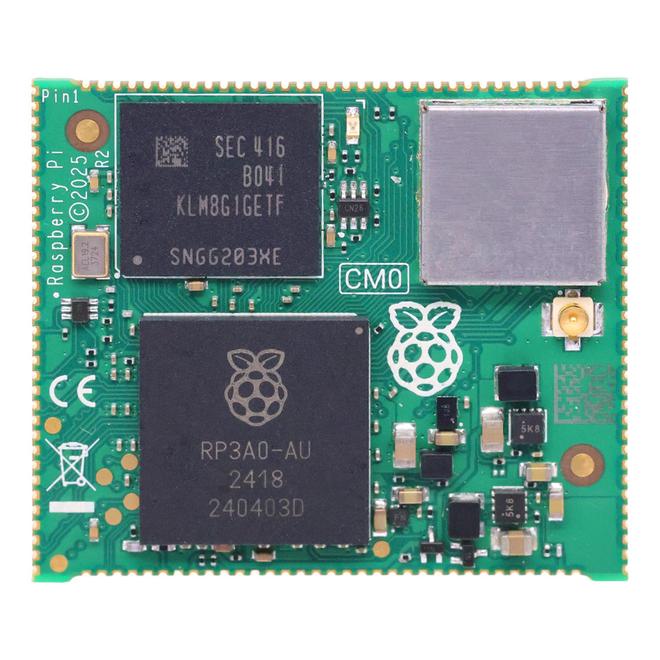 Raspberry Pi CM0 尺寸 39mm×33mm,配备四核 Arm Cortex-A53 @ 1GHz 处理器和 512MB LPDDR2 内存,空闲功耗约 1W、满载约 3W,支持选配 eMMC 闪存和 Wi-Fi + 蓝牙无线模块。