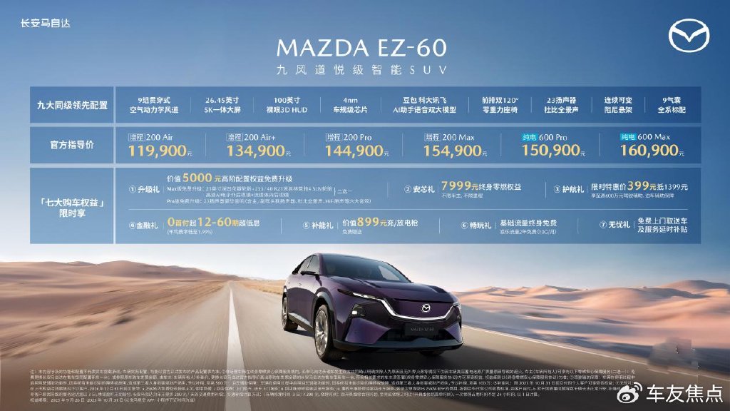 新车共发布了6款车型,提供多达7种颜色选择,从而满足不同消费者的个性化需求。在市场战略上,长安马自达明确指出,MAZDA EZ-60旨在引领新能源汽车市场的智能化潮流,特别是在年轻消费者群体中树立独特的品牌形象。
