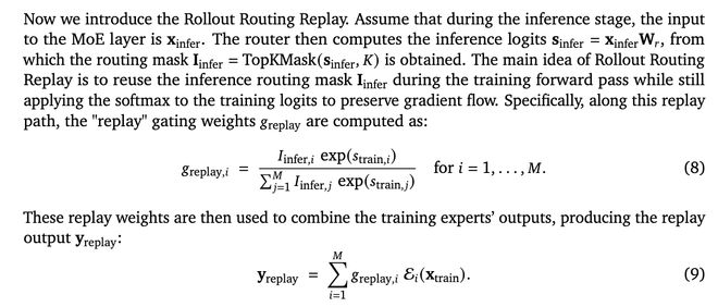 2、提出Rollout Routing Replay,它重用训练引擎内部的推理时间路由分布,以协调训练和推理之间的路由行为;