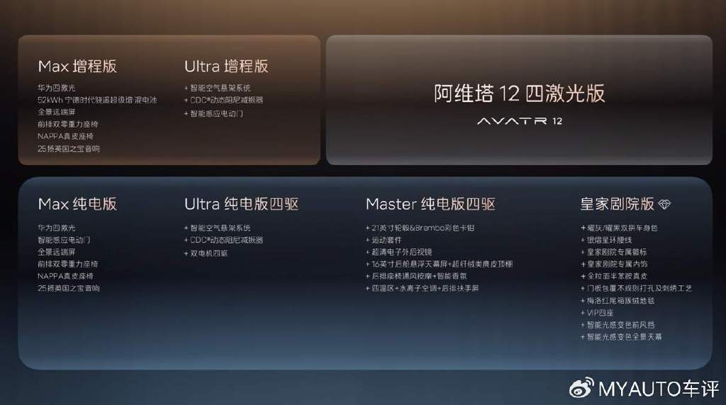 阿维塔12 四激光版提供纯电与增程双动力,全面覆盖用户多元出行场景。纯电动后驱版CLTC续航里程可达755km,从容应对跨城出行;四驱版0-100km/h加速仅需3.8s,性能媲美4.0T V8发动机,带来酣畅淋漓的驾驶体验。增程版全系标配52kWh大容量度宁德时代骁遥超级增·混电池,CLTC纯电续航里程356km,轻松实现“一周一充”的城市纯电通勤自由;综合续航里程更突破1270km,配合5C峰值充电倍率,电量从30%充至80%仅需10分钟,一杯咖啡的时间便可完成补能,带来“增程体验更纯电,续航表现更燃油”的无忧体验。此外,新车底盘系统也进行了重要升级,针对空悬版车型进行了底盘优化与精细化调校,舒适性与操控性同步提升,面对复杂路况也能从容自若。