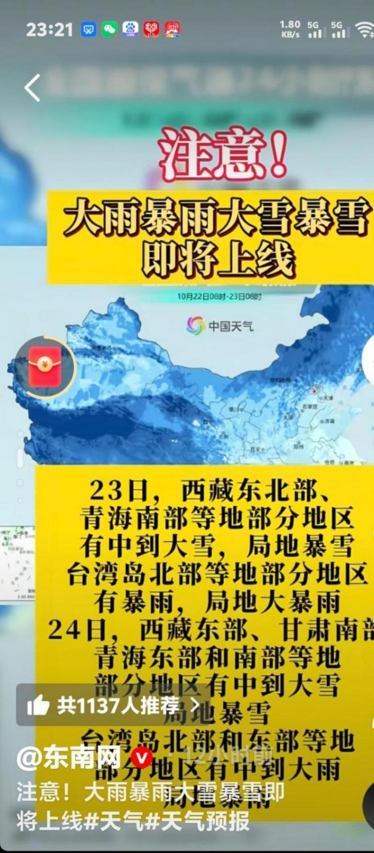 从30日开始,这股冷空气自北向南影响中东部大部地区。咱们来具体看看不同时间不同地方的天气情况:22日,台湾岛北部、广东雷州半岛等地部分地区有大到暴雨,其中海南东南部、台湾岛北部等地部分地区有大暴雨,局地特大暴雨;23日,西藏东北部、青海南部等地部分地区有中到大雪,局地暴雪,台湾岛北部等地部分地区有暴雨,局地大暴雨;24日,西藏东部、甘肃南部、青海东南部等地部分地区有中到大雪,局地暴雪,台湾岛北部和东部等地部分地区有中到大雨,局地暴雨。