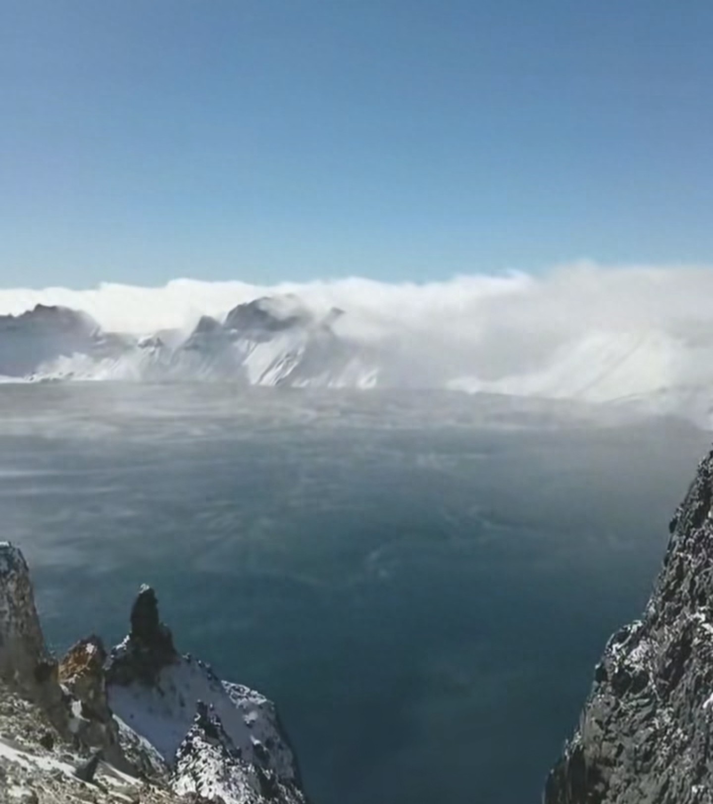 冬日长白山巅,天池湖面蒸汽翻腾,宛如一锅沸腾的开水,与四周冰雪世界形成震撼对比,游客惊呼“人间仙境”。