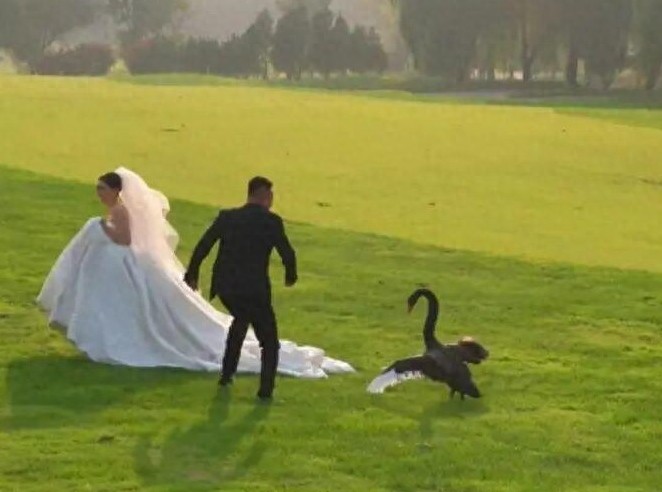 慌乱中,新郎孙先生第一时间挡在新娘身前,小心翼翼地驱赶黑天鹅,全程将妻子护在身后,动作里满是紧张与珍视。事后他笑着猜测,或许是新娘洁白的婚纱太过亮眼,才让黑天鹅产生了好奇。万幸的是,这场意外并未造成任何人受伤。