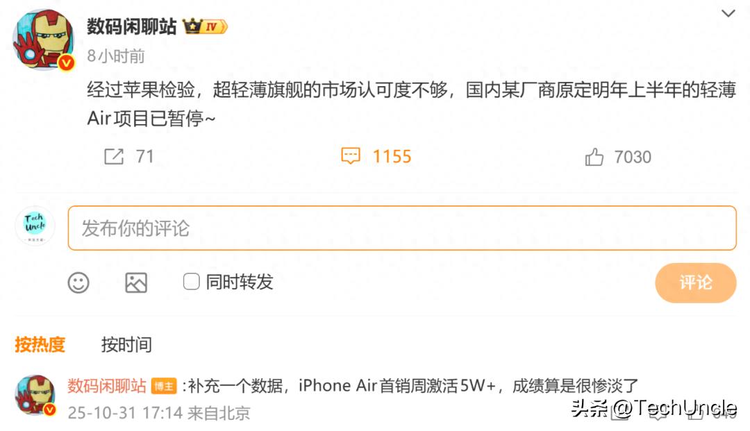 据数码博主 数码闲聊站 爆料称,某国产厂商已暂停原定明年上市的轻薄 Air 手机项目。原因是iPhone Air 首销周仅 5 万 + 的激活量,高开低走首销遇冷。