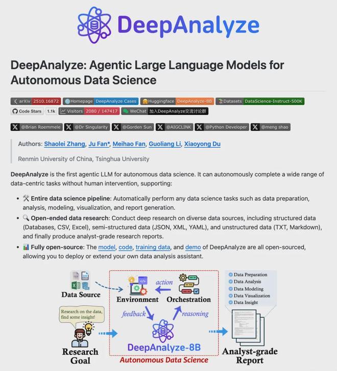 DeepAnalyze的论文、代码、模型、数据均已开源,收获1.1K+GitHub星标,欢迎大家体验!