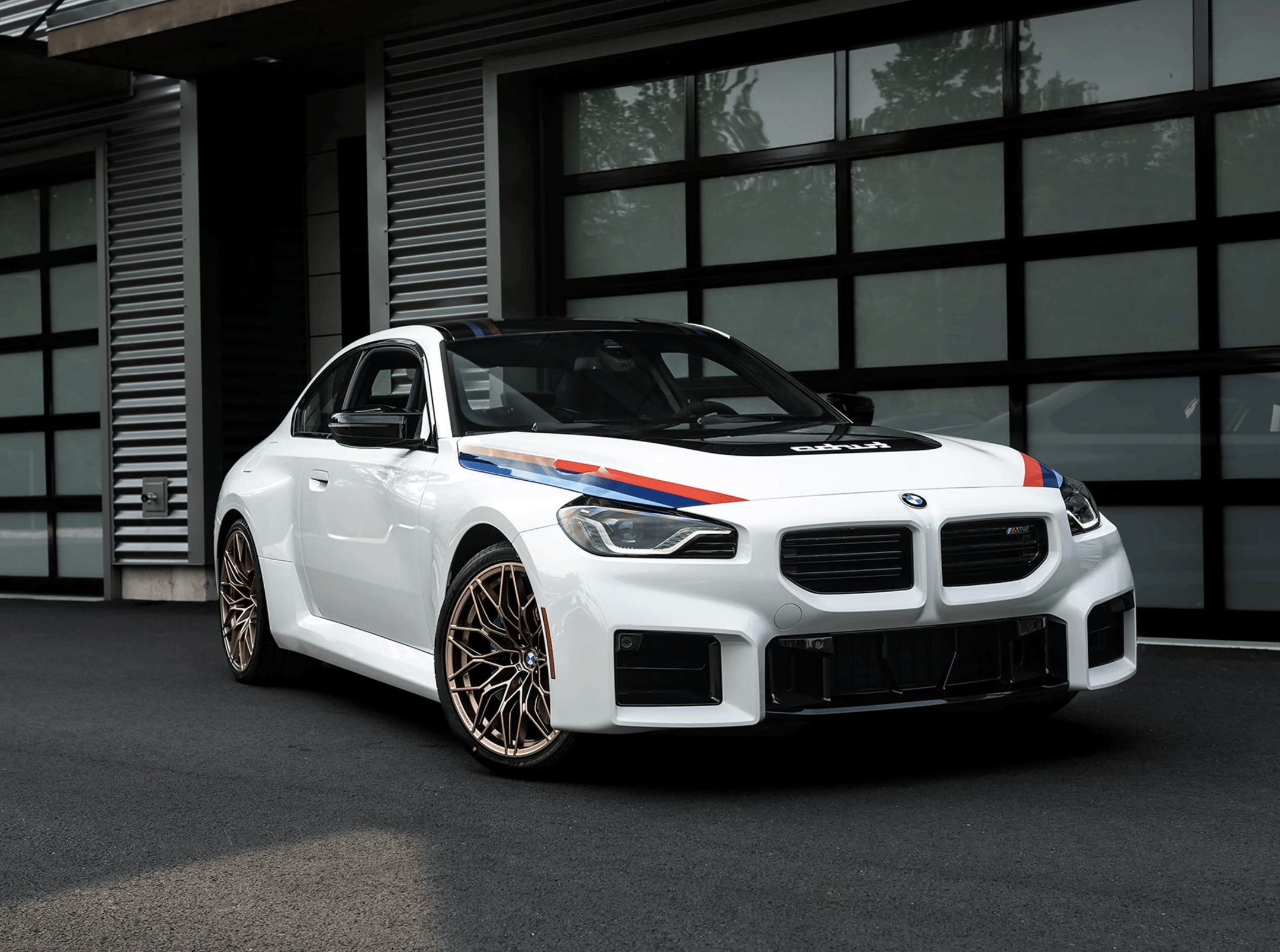 全新的宝马M2 xDrive的车身采用了双门四座轿跑结构,弧线形的车顶搭配着黑色的车窗饰条,就连倒车镜外壳也加入了碳纤维材质,看上去更加高级,也更加轻量化。隐藏式的门把手让车身变得更加简约、耐看,也降低了风阻系数。配备了19英寸铝合金轮圈,搭配着前235/45、后265/40的宽胎,银色的大尺寸刹车盘和蓝色的刹车卡钳,将性能车的优雅、运动气质展现的淋漓尽致。尺寸方面,宝马M2 xDrive长宽高分别为4650*1811*1460mm,轴距2810mm,相比于现款的宝马M2更加长、更扁、更宽。车重接近1900公斤,比后驱版车型重约70公斤。