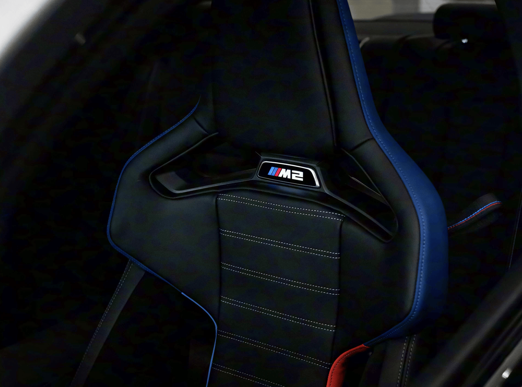 新一代宝马M2 xDrive车内也变得更加激进,配备了小尺寸方向盘采用了麂皮绒材质包裹,并加入了大尺寸换挡拨片和M+、M-拨片。再配上经过轻量化处理过后的碳纤维一体式赛车座椅,人体工程学设计的换挡手柄和红色一键启动按钮,瞬间点燃了埋藏在驾驶员激烈心底里那份儿激烈的驾驶欲望。配备了12.3英寸数字仪表盘与10.25英寸中控屏组成的横跨仪表盘,仪表盘能显示出g值雷达图、输出功率以及扭矩输出等信息。搭载了iDrive 8.5系统,集成导航、娱乐、车辆设置等功能,支持Apple CarPlay、Android Auto以及手势控制。