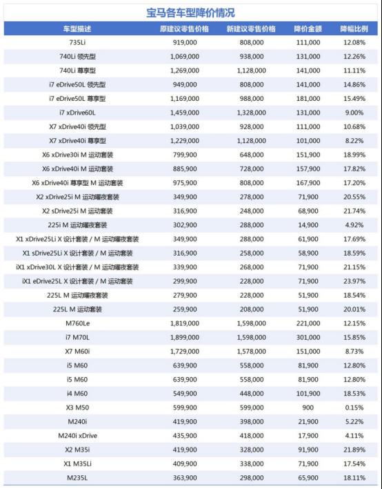 而作为销量主力的宝马3系、宝马5系、宝马X3、宝马X5等一众车型则并没有官方层面的调价信息。不过官方层面的降价也算是仅供参考,具体价格还是要到经销商去谈,其实这些主流车型也已经降价不少了。以我们当地的行情为例,指导价宝马3系终端价格21.5万元起,宝马5系终端价格30.4万元起,宝马X3终端价格27.5万元起,放在以前都是想都不敢想的价格。