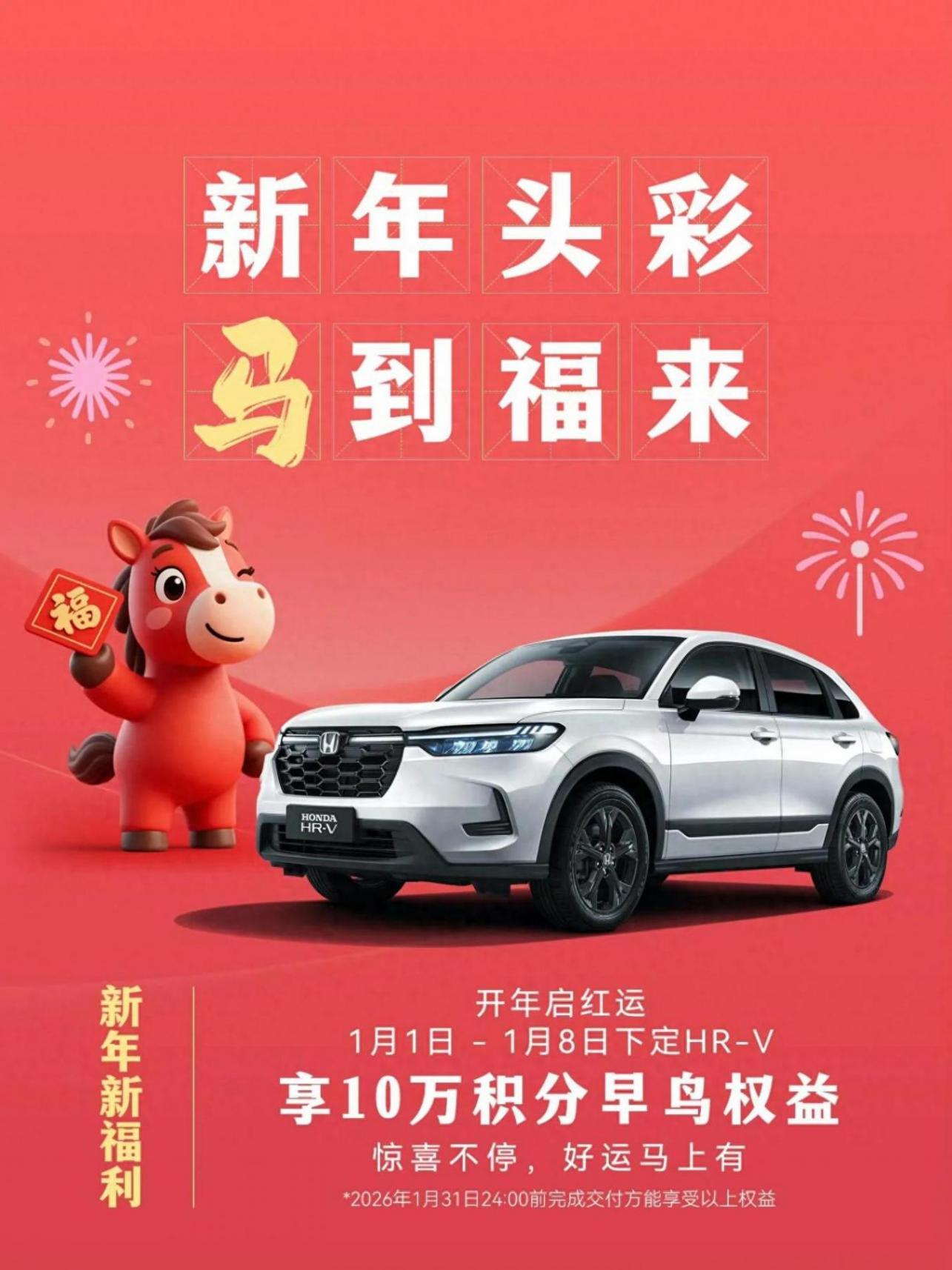 车友们新年好呀!2026年刚开篇,不少朋友是不是都把换新车提上日程,想给新一年添点新惊喜?如果想买紧凑级SUV,那一定要看看本田系的,想必大家还记得2023年HR-V刚登场时的模样,带着满满的年轻活力闯进大家视野,但这两年下来,这款车属实有点太过低调,市场销量一直没掀起太大水花。好在东风本田终于传来重磅消息,新款HR-V敲定上市时间,1月8日就要正式和大家见面,这次还全新推出了Pro版和Max版两款车型,更贴心的是,从现在起一直到1月8日完成下定,就能拿下10万积分的早鸟专属权益。这波新车+福利的组合拳,能不能让HR-V成功出圈?今天咱们就把这款新车从头到尾聊透彻,顺便分享些实用参考,帮打算买车的朋友多份靠谱依据。