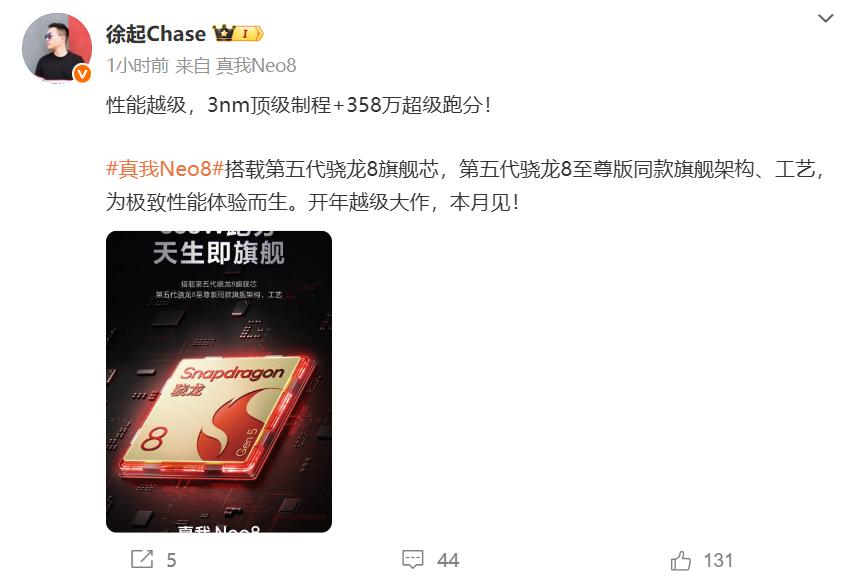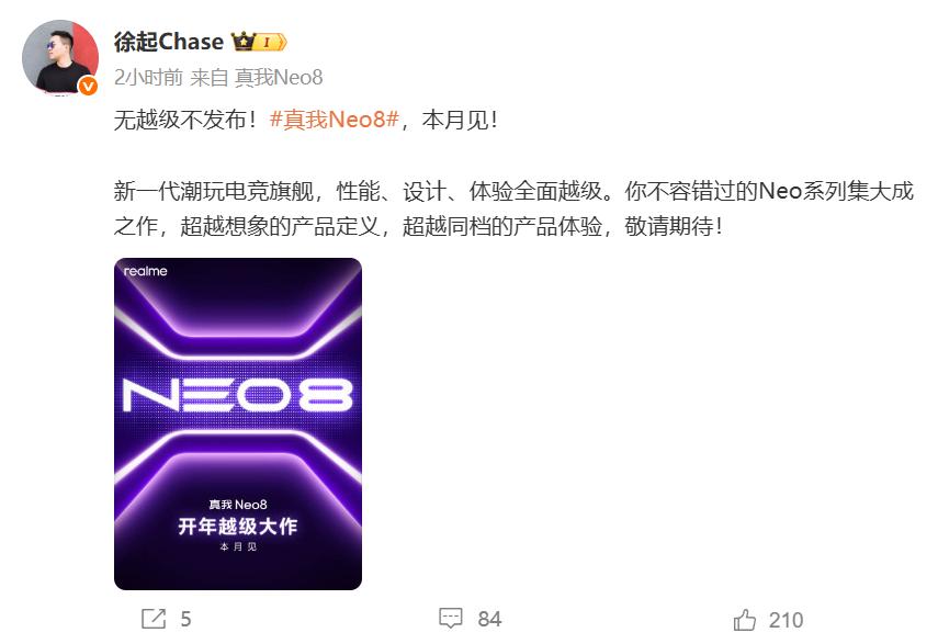 官方已经开始预热真我neo 8手机了,号称新一代潮玩电竞,在性能、设计、体验等全面越级,核心性能方面比较亮眼,会搭载骁龙8Gen 5处理器,这应该是两千元左右最出色的芯片,经过优化后能达到358万性能跑分。