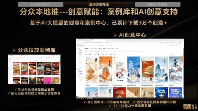 分众智投还具有为合作伙伴提供AI智能制作素材的能力,通过案例库和AI创意支持,实现高效创意赋能。